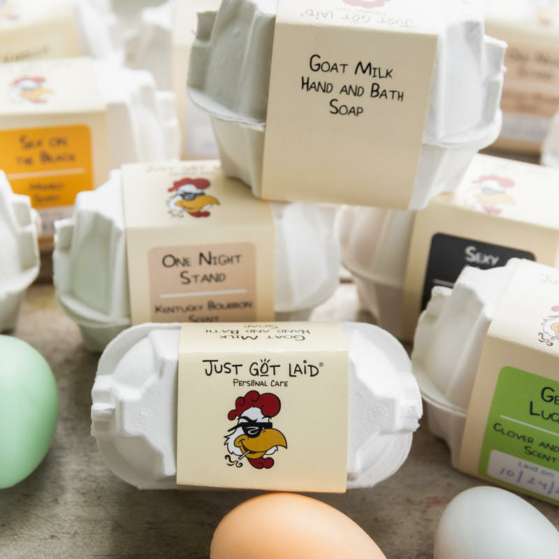 2 soap eggs, 2.5 oz each, individually wrapped in bio-degradable material and tucked into a 2-egg carton